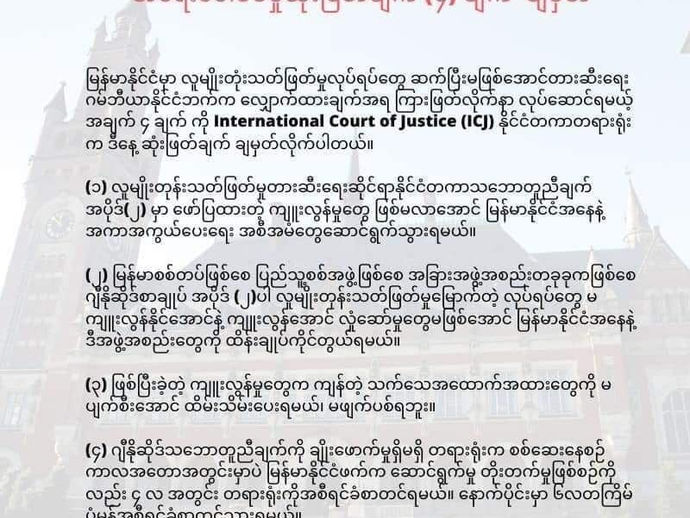 ICJ ရဲ့ဆုံးဖြတ်ချက်ချအပြီးမှာ ဖွတ်၊ မဘသ ၊ အစိုးရဆန့်ကျင် တပ်အကောင့်များနဲ့ နေဝင်းအမျိုးကုလမှာလုပ်တဲ့မိန်းမတွေက ICJ ရဲ့...