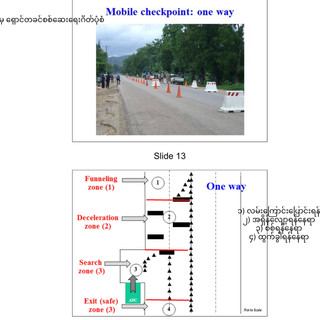 နောက်ဆုံးက မိမိတို့ စစ်တဲ့နေရာကို အမှတ်အသားပြပြီး ကားတွေကို အရှိန်လျော့မောင်း၊ မှန်ချမောင်းခိုင်းပြီးခရီးသည်တွေကို လမ်းဆင်းလျှောက်ခိုင်းတာပါ။ အရှိန်မလျှော့တဲ့ကားကတော့ ဥပဒေအရ အရေးယူရမှာပါ။အဆိုပါလမ်းကို တောင်ကုန်းရှိတဲ့ သစ်ပင်အကြီးတွေရှိတဲ့နေရာမှာ ရွေးရင် ပိုကောင်းပါတယ်။ မိမိတို့စခန်းချရာနေရာကို ရန်သူဝင်မလာနိုင်အောင် ကာဗုံးထောင်ထားရမှာဖြစ်သလို မိမိဆုတ်မယ့်လမ်းမှာလဲ ထောင်ထားရပါမယ်။တောင်ပေါ်မှာ/ သစ်ပင်ပေါ်မှာ လက်ဖြောင့်သေနတ်သမားတွေ ရှိနိုင်ရင် ပိုကောင်းပါတယ်။