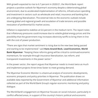မနေ့ကဒေါ်အောင်ဆန်းစုကြည်မွေးနေ့မတိုင်ခင်မှာအစီရင်ခံစာထုတ်ပါတယ်။ သူကတိုင်းပြည်စီးပွားရေးတိုးတက်မှုဟာ၂၀၁၈-၂၀၁၉မှာ၆.၅% ရှိပြီး ဒါဟာစက်မှုလုပ်ငန်း၊ဝန်ဆောင်မှုလုပ်ငန်းနဲ့ဆောက်လုပ်ရေးလုပ်ငန်းတွေကနေအချိုးကျတိုးတက်လာတာလို့သုံးသပ်ထားပါတယ်။ဒါဟာကမ႓ာကြီးမှာကုန်သွယ်ရေးစစ်ပွဲတွေကြားထဲကတိုးတက်နေပြီးဆက်ပြီးတိုးတက်မယ်လို့ခန့်မှန်းထားပါတယ်။၂၀၂၀-၂၀၂၁မှာ၆.၇% အထိတိုးတက်လာမယ်လို့ခန့်မှန်းပါတယ်။ဒီလိုတိုးတက်ဖို့လွယ်လားဆိုတော့မလွယ်ပါ။မိမိလက်နက်ကိုင်အဖွဲ့ကိုအမိန့်မပေးနိုင်ဘဲသူပုန်များစွာနဲ့ရင်ဆိုင်နေရတယ့်အစိုးရအတွက်ဒါဟာကြီးမားတဲ့အောင်မြင်မှုပါ။နောက်ပြီးငွေကြေးဖောင်းပွမှုဟာလဲ၆.၆% မှာသာရှိမှာပါ။ဒါဟာဘစိန်လက်ထက်က၁၀% ကျော်ထက်နည်းနေပါတယ်။ဒါဟာပြည်သူတွေရဲ့ပိုက်ဆံတန်ဖိုးတက်လာတာပါ။