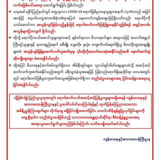 ရန်ကုန်မြို့ကြီး ဘေးမသမ်းပဲ အေးချမ်းရလေအောင် မြို့တော်သူ/သားများ လုံလုံခြုံခြုံ နေထိုင်ပြုမူကြရန် အထူးလိုအပ်သော အခြေအနေနှင့် အချိန်အခါသို့ ရောက်ရှိနေပါပြီ။ အတိအကျ လိုက်နာကျင့်သုံးမှသာ (ယခင်ရေးခဲ့သလို) အရေးတကာအရေး အရေးကြီးဆုံး ကျန်းမာရေးဟူသော ထူးမြတ်သည့်လာဘ်ကြီးရရှိပြီး မြို့တော်နေပြည်သူများ ကျန်အရေးများကို ဆောင်၍ အောင်နိုင်ပါလိမ့်မည်။