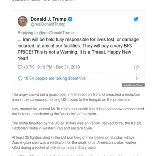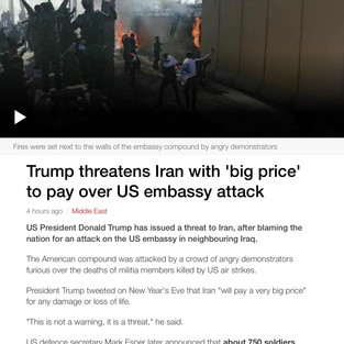အဲ့ဒီလိုအမေရိကန်သံရုံးကို မီးရှို့လို့ ဒီနေ့မှာဘဲ အီရတ်မှာရောက်နေတဲ့ အီရန်က စစ်ဗိုလ်ချုပ်ကို အမေရိကန်က မောင်းသူမဲ့လေယဉ်နဲ့ ပစ်သတ်ခဲ့ပါတယ်။ အီရတ်ပြည်သူတွေကို ဆဒမ်ဟူစိန်အောက်ကလွတ်အောင် လုပ်ပေးခဲ့ပေမယ့် သူတို့က အမေရိကန်ကို ကျေးဇူးမတင်ပါ။ သူတို့က ဘာသာရေးသာအဓိကပါ။ အီရတ်မှာက မူစလင်ပေမယ့် ဂိုဏ်းမတူတဲ့ ရှိးယားတွေကအများစုပါ။ သူတို့ဟာ ဘာသာရေးဂိုဏ်းအားဖြင့် အီရန်နဲ့ တူပါတယ်။ ကမ္ဘာပေါ်မှာက ဆူနီအများစုပါ။ ဒါကြောင့် အဲ့ဒီမှာဖြစ်တာဟာမြန်မာတစ်ပြည်လုံး ၁၉၄၈ ထဲက ပြည်တွင်းစစ်ကြောင့် လူသေတာထက်များသလို ဆက်တိုက်မယ့်ပုံပါ။