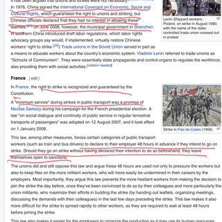 ပြင်သစ်မှာလဲ ဆန္ဒပြပွဲကို ခွင့်ပြုပေမယ့် သမဂ္ဂတွေဟာ တရားဝင်မဲခွဲရတာ ၄၈ နာရီ အလုပ်ရှင်ကိုကြိုတင်သတိပေးရတာတွေရှိပါတယ်။ ဒါတွေမလုပ်ဘဲ ဆန္ဒပြရင် ဖြုတ်နိုင်သလို လုပ်ငန်းခွင်ကို ပိတ်ရင်ဖမ်းပါတယ်။